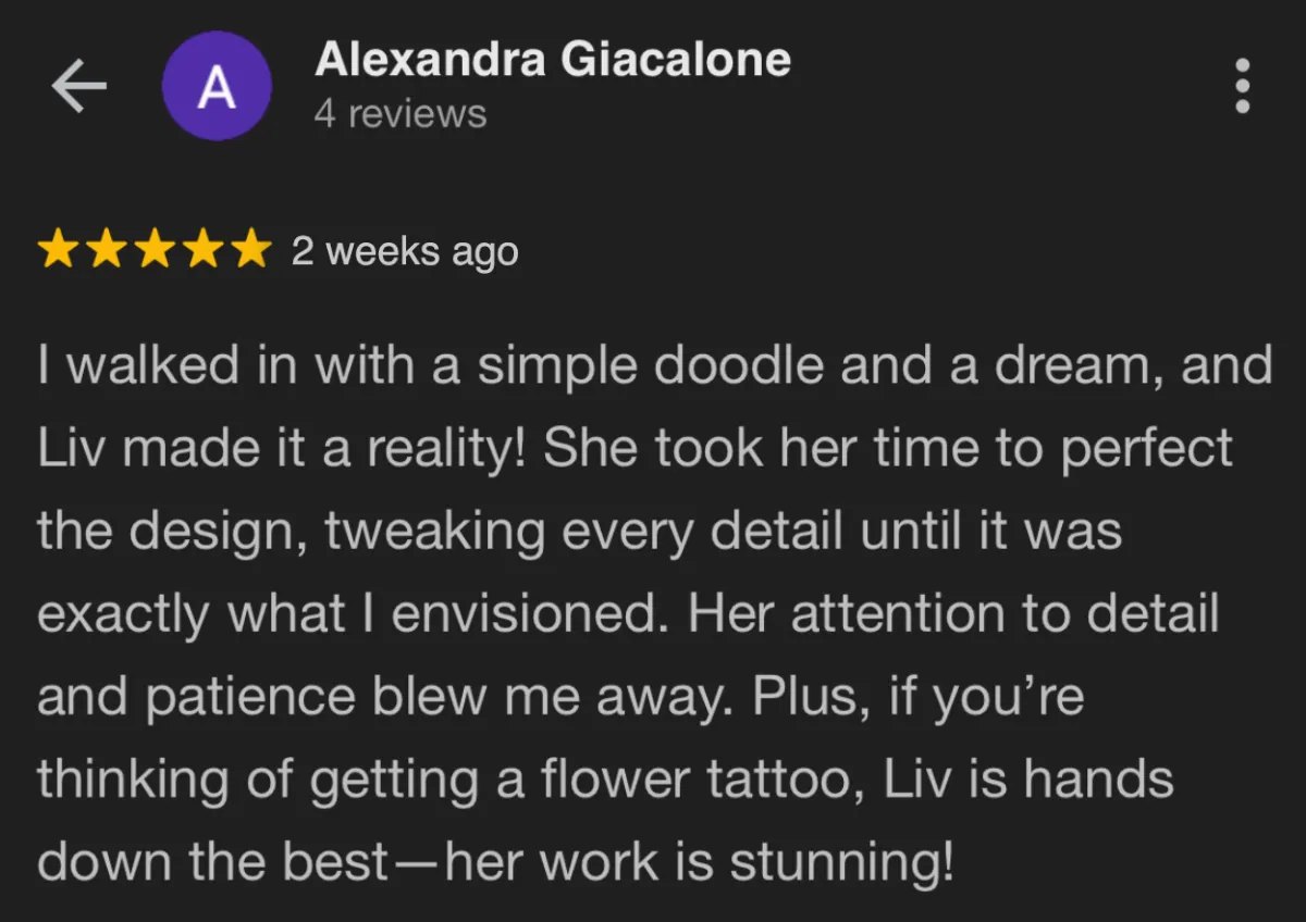 This introductory call is where we'll ask about your design ideas, photo references, placement area, approximate size, and your availability — all to help bring your dream tattoo to life!